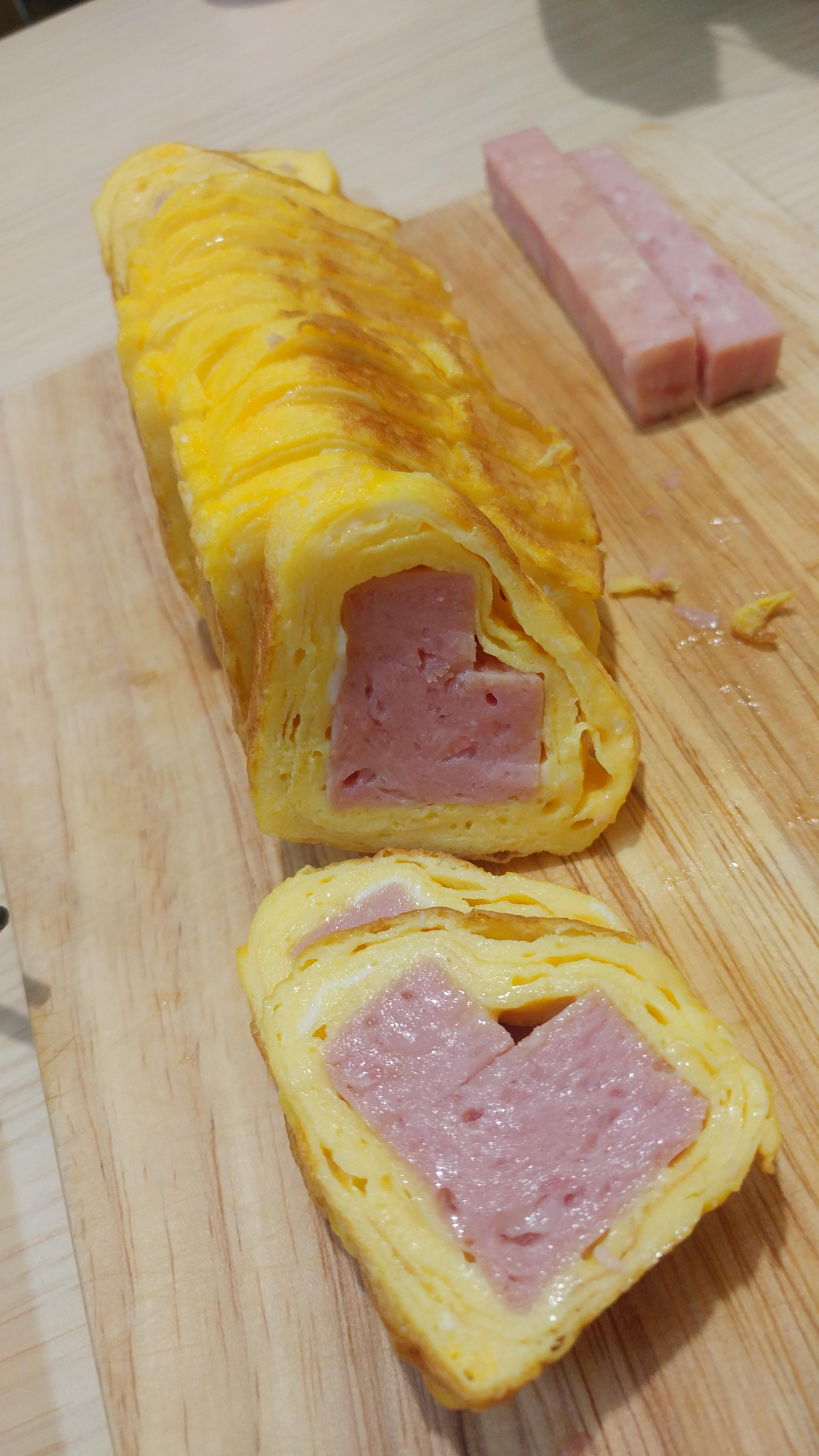계란을 풀어서 얇게 펼친뒤 살짝 익을때쯤 햄 2개를 하트모양으로